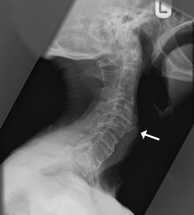 A 79-year-old man presented with painless dysphagia. Results of an oesophagogastroduodenoscopy were unremarkable. A dynamic videofluoroscopic examination was diagnostic, revealing hypertrophic cervical osteophytes indenting the hypopharynx and oesophagus. The osteophytes were also seen on a lateral cervical spine radiograph (Box). The dysphagia responded to dietary modification.