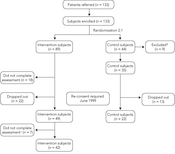 Eighteen intervention subjects did not fully complete the assessment and dropped out early in the study (Box 1). Re-consent was needed from participants in June 1999, as the original global consent form had a date limitation, and this resulted in a large drop-out (22 intervention, 13 control). A further seven intervention subjects did not return their project-specific questionnaires but did complete the whole-of-trial questionnaires mailed to them by the local evaluation team.