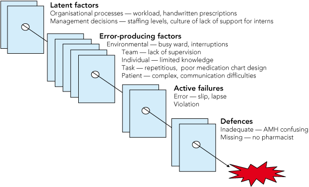 Causes of the errors, presented in accordance with Reason’s model of accident causation, are shown as holes in layers of Swiss cheese to indicate the four levels in which failures occur, enabling an accident to penetrate barriers and defences, resulting in harm to the patient (Box 3).5