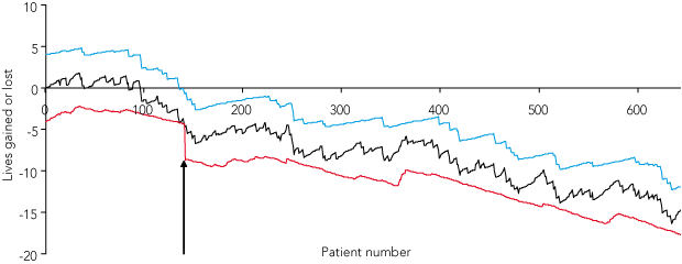 The graphical tool used in this study was an adaptation of the VLAD, which incorporated control limits derived from the risk-adjusted cumulative sum.16,17 Briefly, the VLAD shows a plot, for a series of consecutive patients over time, of the cumulative risk-adjusted difference between observed and expected deaths, expressed as the statiscal estimate of excess lives gained or lost. Upper and lower control limits (based mathematically on the sequential probability ratio test2 applied to 10 000 iterations of specified datasets of 10 000 patients) were added which, when breached by the curve, corresponded, respectively, to a real 30% decrease or increase in mortality with 95% confidence. Each time the control limit was breached, the limits were reset, with the breach point taken as the new baseline. More in-depth explanations of the mathematics involved can be found elsewhere.4,5,17