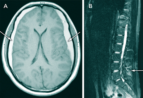 A 16-year-old boy with a 3-month history of intermittent postural headaches presented with sudden worsening headache after a game of soccer. The results of a neurological examination were unremarkable. Magnetic resonance imaging showed elongation of the midbrain, bilateral frontoparietal subdural haematomas (Figure, A), and a collection of fluid within the soft tissues overlying the lumbar spine (Figure, B). The cerebrospinal fluid (CSF) opening pressure on lumbar puncture was low (60 mmHg). Spontaneous intracranial hypotension was diagnosed, and the response to conservative treatment was good.
