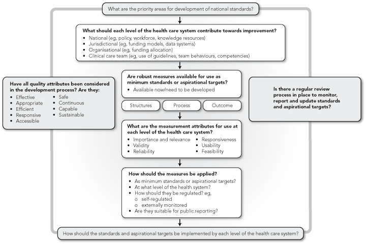 Despite the reservations expressed about methodological issues in identifying robust measures for standards, patients are entitled to expect information about their treatment. We suggest that Australian health care standards would be best developed within a broad measurement framework that matches assessment of system-level performance with use of appropriate measurement methods, measures and indicators, reporting and regulation (Box).30,31 Further, we caution against over-reliance on external regulatory systems for driving improvement. Some authors have reported perverse behaviours resulting from the introduction of standards or fixed targets which undermine a holistic approach to quality improvement in all its domains and divert attention from unmeasured areas of care.32,33 The chasing of aspirational targets may incur considerable opportunity costs in the absence of studies that confirm cost-effectiveness from a policy-making perspective.34 Once performance thresholds become entrenched, there may be less flexibility for reviewing and redefining standards according to changing circumstances.