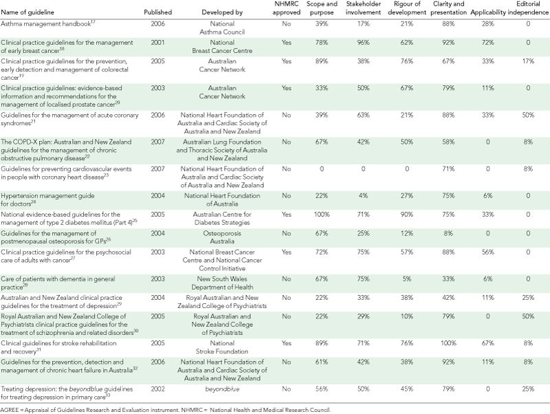 Our study has several limitations. The selection criteria allowed the inclusion of a wide range of important health conditions and of guideline producers. However, our results may not be generalisable to all Australian guidelines on chronic diseases or to guideline producers. We used the generally agreed definition of a guideline as “a set of systematically developed statements to assist practitioner and patient decisions about appropriate health care for specific clinical circumstances”.45 Because of the definition adopted and the format of the AGREE instrument, we did not include documents produced by the Royal Australian College of General Practitioners (RACGP) or Therapeutic Guidelines Limited in our analysis.