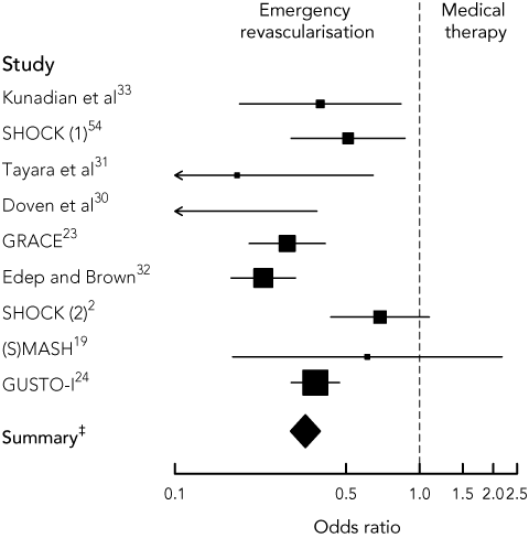 1 Comparison of emergency revascularisation (ERV) with medical therapy in published studies of patients with ST-segment-elevation myocardial infarction and cardiogenic shock