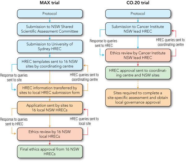 1 Ethics approval process in New South Wales using the non-centralised review system (for the MAX trial8) and the centralised review system (for the CO.20 trial9)