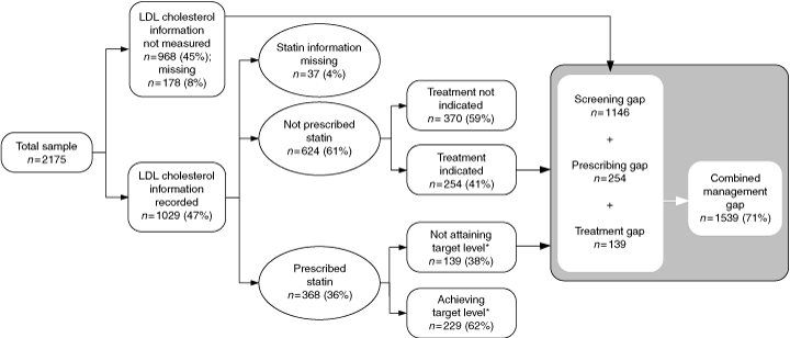 Results: Blood pressure (BP) had not been recorded for 13% of the sample. Of 1400 patients not prescribed antihypertensive medication, treatment was indicated for 8%. Of 821 patients already prescribed antihypertensive medication, 59% were achieving target BPs. Data on low-density lipoprotein (LDL) cholesterol levels were not available for 53% of the 2175 patients who should have had lipid screening according to the guidelines. Of 624 patients not prescribed a statin, treatment was indicated for 41%. Of 368 already prescribed a statin, 62% were achieving target LDL cholesterol levels. Sufficient data for calculation of absolute risk had been recorded for 74% of the 1736 patients for whom such calculation was recommended by the guidelines. The remaining 26% either had at least one required variable unmeasured (20%) or missing from the data collection (6%). For those at high absolute CVD risk (without established disease) and those with established CVD, 23% and 53%, respectively, had been prescribed both antihypertensive medication and a statin.