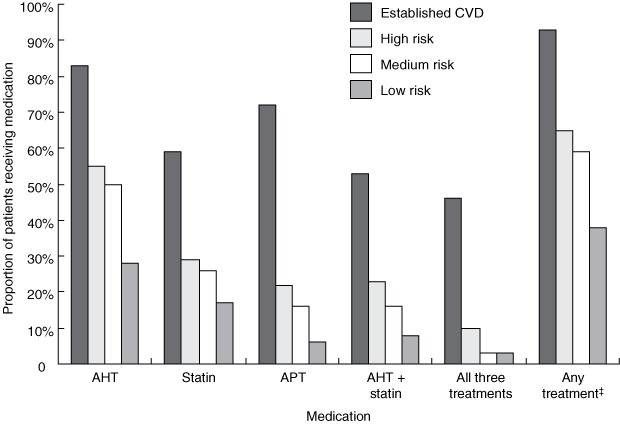 6 Among patients for whom absolute risk of CVD should have been estimated,* proportions of patients receiving antihypertensive therapy (AHT), a statin or antiplatelet therapy (APT), by CVD risk category†