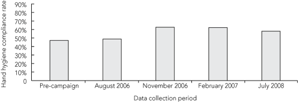 We chose overt observation because it was a repeatable and easy method that could be sustained past the project timeline. This method, whose cost-effectiveness is supported by a WHO expert advisory panel,12 was based on the Geneva program,11 which has been successfully replicated in Australia.5 Patient mix, a wide range of individual hand hygiene practices and the Hawthorne effect13 will always have an impact on the measurement of compliance and cannot be overcome by indirect observation.14