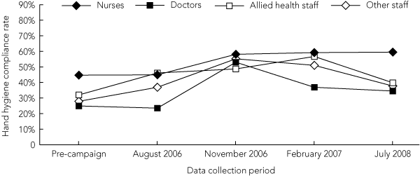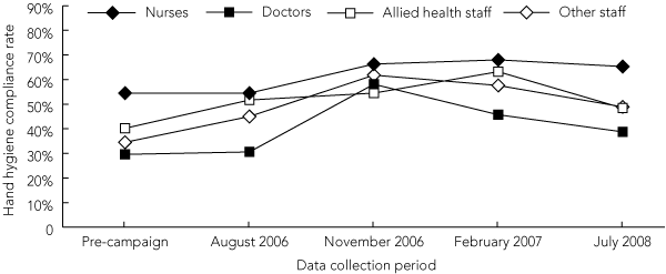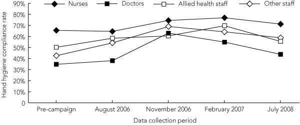 The level of activity in a ward during 20-minute observation periods may underestimate the number of hand hygiene opportunities. However, the same methodology was used in the seminal Geneva study,11 which made a mean of 2869 observations over a total of 7 months between 1994 and 1997, and also in a Victorian study5 involving a mean of 711 observations made at baseline, 4 months and 12 months. Our rates were based on a mean of 7747 hand hygiene opportunities for five observation periods, making our study three times larger than the seminal study11 and 11 times larger than the Victorian study.5 As long as the measurement of hand hygiene compliance is fairly simple, it can be made to be strictly repeatable and result in the Hawthorne effect having a similar impact across survey periods. Although the potential for the Hawthorne effect was high in our study, we believe the impact was limited, as the compliance rate recorded in the first audit (August 2006) remained similar to the pre-campaign rate. Moreover, the Hawthorne effect from peer group pressure does not need to be considered a negative outcome, as it may provide positive assistance towards culture change.15