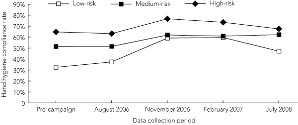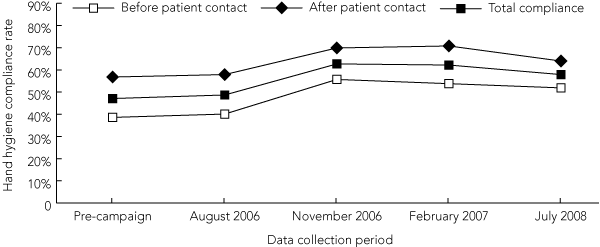 Results: The overall hand hygiene compliance rate improved from 47% before the intervention to an average of 61% over the last three observation periods (P < 0.001). All professional groups sustained improved compliance rates except medical staff, whose practices reverted to pre-intervention rates. Nursing staff maintained significantly improved compliance, with an average rate of 67% after the intervention. Overall hand hygiene compliance before patient contact improved from 39% (pre-campaign) to 52% (July 2008) (P < 0.001). Overall compliance after patient contact improved from 57% to 64% (P < 0.001) over the same period. Compliance associated with medium-risk contacts increased from an average of 51% in the first two observation periods to an average of 62% over the last three observation periods (P < 0.001). The corresponding compliance rates associated with low-risk contacts were 35% and 56%, respectively (P < 0.001).