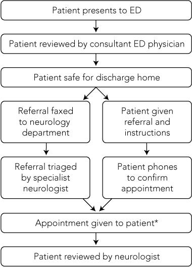 One approach to tackle such problems has been the development of “fast-track” specialist outpatient services. A number of these services have been successfully developed in the United Kingdom across a range of specialties, taking referrals from general practitioners.4-6 Here, we report the first 12 months of data from the ED Rapid Access Neurology (ED RAN) clinic, which we believe is a novel model for managing outpatients with neurological problems referred from the ED setting in Australia. This model could help ED physicians and limit unnecessary hospital admissions and, if successful, may provide a framework that could be expanded across other hospitals and specialties throughout Australia.