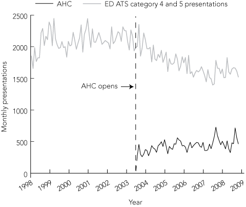 During the study period, there were 345 465 presentations to the ED. After the opening of the AHC in March 2003, monthly low-urgency presentations appeared to decline, while the number of consultations at the AHC appeared to grow (Box 2).