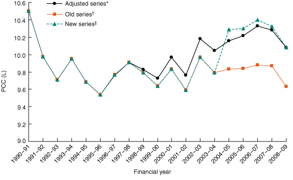As Box 1 shows, on the old assumptions of PACV percentages for wine, annual estimates of PCC of alcohol varied between about 9.6 and 10.0 litres, with the exception of a high point in 1990–91 of 10.5 litres. Had the PACV percentage for wine not been updated in 2010 (for table wines in particular), the 2008–09 PCC of alcohol would have apparently declined to one of its lowest points in almost two decades.
