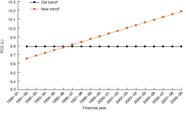 The new ABS PCC estimates give the impression that alcohol consumption rose sharply in 2004–05. However, it is more likely that the increase in the PACV percentage of wine occurred steadily over the past decade or so.17 When the change in total wine alcohol content (from 11.4% in 1998–99 to 12.7% in 2008–09) is evenly apportioned to each year from 1998–99 onwards, a more gradual increasing trend results. We found a gradual increase from year to year of about 1%.