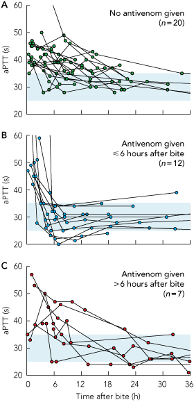 The aPTT appeared to normalise rapidly with antivenom therapy. Ten patients with a raised aPTT who were given antivenom ≤ 6 hours after the bite had a normal aPTT when blood was next collected (Box 4, Box 6). Of seven patients with a raised aPTT who received antivenom more than 6 hours after the bite, the aPTT had normalised before antivenom was given in five (20–32 h after bite) and aPTT recovered by the time of the next blood collection in the other two (8.8 h and 9 h after bite). Raised CK level did not appear to resolve more rapidly when antivenom was administered (Box 5). Three patients with myotoxicity received antivenom but were given it 23, 26 and 30 hours after the bite, respectively. The three patients with local ulceration were given antivenom at 2.25, 26 and 30 hours after the bite, respectively, and ulcers were not noted until more than 24 hours after the bite. Box 6 shows the clinical features of patients with anticoagulant coagulopathy who were given early antivenom (≤ 6 h after bite) and patients with anticoagulant coagulopathy who were given delayed antivenom (> 6 h after bite) or no antivenom. Myotoxicity did not occur in any patients given early antivenom but occurred in 20% of patients given no antivenom or delayed antivenom.
