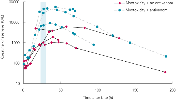 * The shaded area indicates the timing of antivenom in those who received it (23, 26 and 30 h after bite). |