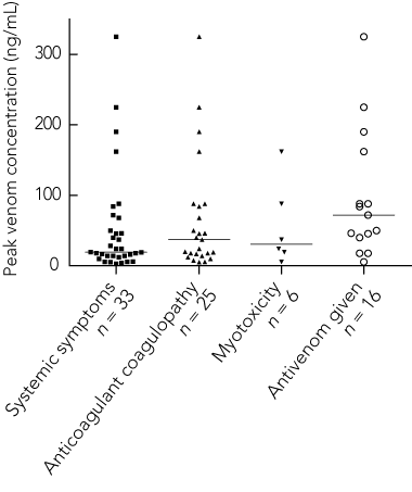 Venom concentrations were measured using enzyme immunoassay (EIA) for patients for whom serum samples were available. The methods are described in detail elsewhere.16,17 In brief, polyclonal antibodies (IgG) to RBBS were raised in rabbits, conjugated to biotin, and used to develop a sandwich EIA with streptavidin-horseradish peroxidase as the detecting agent. The limit of detection of the EIAs was 0.1 ng/mL. These assays only detect free venom that is not bound to antivenom. The peak venom concentration was recorded for each patient.