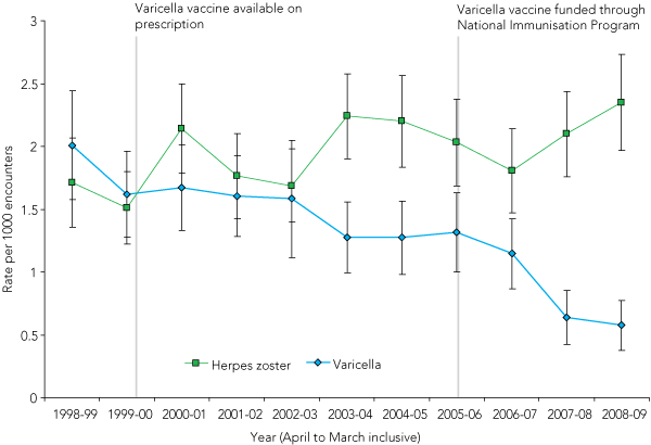 Conclusions: There has been a significant rise in the HZ management rate and a decrease in the varicella management rate in Australian general practice over the period 1998–2009. Introduction of vaccination for HZ prevention at age 60 years should be considered, although addition of this vaccination to the existing schedule for vaccination at age 65 years is also likely to be beneficial and may be more pragmatic.