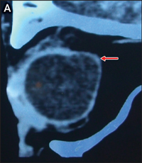 A: Sagittal computed tomography scan showing left periorbital soft tissue thickening and posterior staphyloma. |