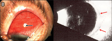 B: Superior scleral injection and B-scan ultrasound showing fluid in Tenons capsule and scleral thickening, consistent with anterior and posterior scleritis. |