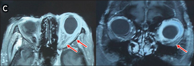 C: Magnetic resonance images showing high T2 signalling and enhancement of the left sclera, extraocular muscle insertions, and distal optic nerve. |