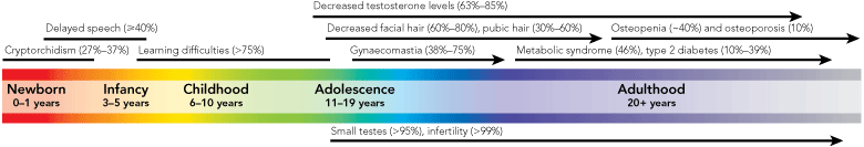 The health outcomes consequent on making the diagnosis of KS are unclear, but an array of biomedical and psychosocial endpoints can be identified for which there are both empirical and evidence-based data in support of interventions. For example, up to 85% of males with KS will be testosterone-deficient after puberty,2 which may have profound medical and psychosocial impacts. Treatment may alleviate the symptoms,23 in addition to reducing condition-related morbidity and mortality.24