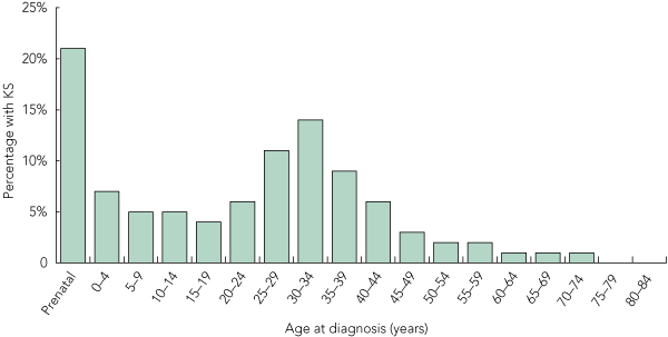 Birth prevalence was estimated by adjusting the prenatal prevalence for maternal age using direct standardisation. Maternal age-specific rates of pregnancies involving a fetus with KS for the period 1986–2006 were calculated for each specified age group by dividing the number of prenatal diagnoses by the number of mothers undergoing prenatal diagnostic testing in each age group. This age-specific rate was applied to the population of women giving birth in each age group to estimate the expected number of births of babies with KS.