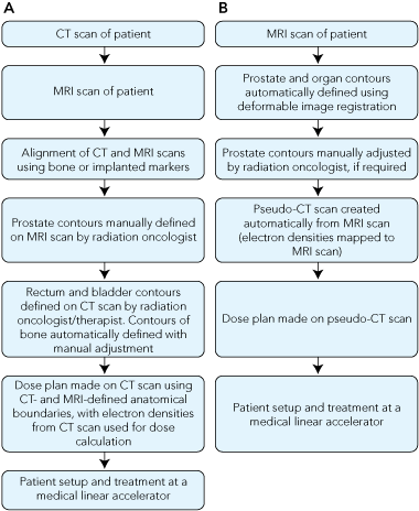 1 (A) Steps in the conventional prostate radiotherapy workflow with computed tomography (CT) and magnetic resonance imaging (MRI); and (B) the proposed new radiotherapy workflow based on MRI only