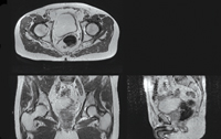 A: Axial, coronal and sagittal views of the MRI scan of the pelvic region of one patient. |