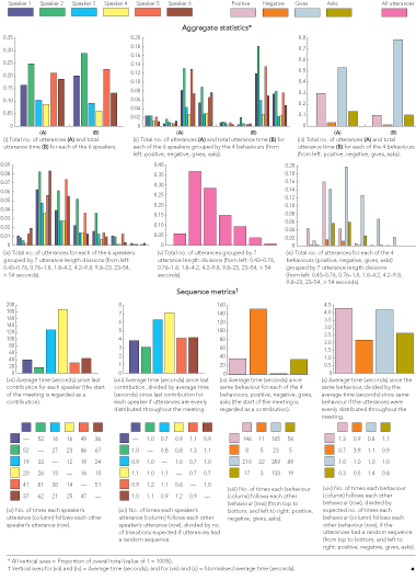 Aggregate statistic metrics (counts of various types of annotations) give an insight into the meeting interaction. For instance, there are several dominant speakers (Box 2, i) and the short utterances tend to be positive behaviours (Box 2, vi). The aggregate statistic metric plots could be subdivided further to show the contributions of the different stages of the meeting.