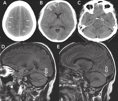1 Initial computed tomography scan of the brain (A–C), and magnetic resonance images 6 months later (D, E)