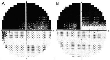 During routine follow-up 10 weeks later, the patient reported persistent difficulty with reading since the operation and that he was experiencing problems differentiating colours. His visual acuity was found to be 6/5 in the right eye and 6/18 in the left, with symptoms of defective colour vision (3/14 Ishihara plates correctly identified with the right eye, and 4/14 with the left). A minor cataract was found in his left eye, but there was no other intraocular abnormality in either eye. His optic discs appeared healthy without pallor in both eyes (and remained so on further follow-up several years later). Computerised visual field perimetry testing conducted at 10 weeks showed bilateral superior altitudinal defects (Box 2). Routine visual evoked potentials showed normal latencies. However, multifocal visual evoked potentials showed normal latencies with decreased amplitude in superior fields bilaterally.