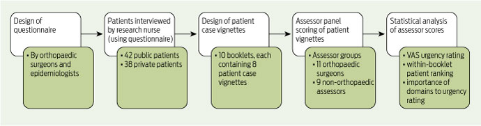 Results: A broad spread of perceived urgency was evident among the patients. For each group of eight patients, there was moderate agreement on overall urgency rankings between the two groups of assessors. Linear regression demonstrated that pain was the dominant determinant of urgency score for both assessor groups. Orthopaedic surgeons also took into account limitations to mobility and concurrent medical illness but gave less priority to psychological distress or social circumstances. For the non-orthopaedic assessors, limitations to mobility, social circumstances and psychological distress also contributed to urgency.