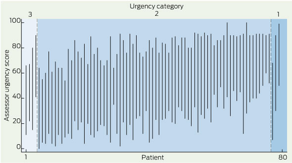 Assessor urgency ratings for each patient, presented in order of the urgency category assigned by their recruiting orthopaedic surgeon, are shown in Box 2. Within each urgency category, the patients are presented in order of mean VAS urgency rating, with each patient’s data presented as a line joining minimum to maximum VAS urgency rating. The results indicate considerable heterogeneity of perceived urgency among the patients in each category and substantial overlap between the perceived urgency of patients across the three categories.