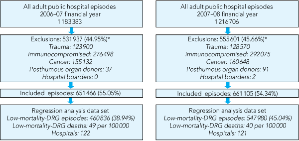 The primary outcome was episodes of death in LM-DRGs. The Agency for Healthcare Research and Quality (AHRQ) death-in-LM-DRG indicator,3 translated by the Victorian Department of Health (International classification of diseases, injuries and causes of death. 9th revision [ICD-9] to ICD-10-AM),8 was applied to the VAED. LM-DRGs are defined as DRGs with a total mortality rate of < 0.5% over the previous 3 years, or < 0.5% in any of the previous 3 years.2 As specified by the AHRQ, episodes with any code for trauma, immunocompromised state or cancer were excluded from the analysis as patients with these conditions have higher non-preventable mortality. Episodes with a care type indicative of a posthumous organ donor, hospital boarder (receives food and/or accommodation, but for whom the hospital does not accept responsibility for treatment and/or care)9 or unqualified neonate (neonates who are 9 or fewer days old and do not meet the criteria for admission)9 were also excluded.8