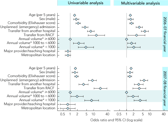 Box 3 shows the associations between patient and hospital characteristics and death in LM-DRG episodes. Increased age and level of comorbidity, being male, admission from a residential aged care facility, interhospital transfer and emergency admission were independently associated with an increased risk of death in LM-DRG episodes (odds ratio 95% CI above 1.0; P < 0.05). Lower hospital volume was also found to be associated with an increased risk of death in LM-DRG episodes, compared with higher volume hospitals (P < 0.05). Hospital metropolitan location and major provider/teaching hospital status had no significant association with risk of death in LM-DRG episodes (P > 0.10), and were therefore not entered into the multivariable model. There was a high level of consistency in the characteristics identified in each cohort and the levels of association with risk of death in LM-DRG episodes, suggesting that our findings can be generalised across yearly cohorts.