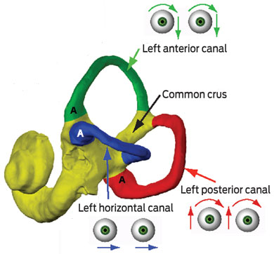 Each canal is made up of a tubular duct ending in a distended ampulla (A) which contains semicircular canal receptors embedded within its cupula. 1. Left posterior canal — a left Dix–Hallpike test evokes upbeating counterclockwise torsional nystagmus (from the patient’s perspective) (Video 1). 2. Left horizontal canal — a side-lying test (or roll test) evokes horizontal nystagmus (Video 2). 3. Left anterior canal — a left or right Dix–Hallpike test evokes downbeating counterclockwise torsional nystagmus (from the patient’s perspective) (Video 3).