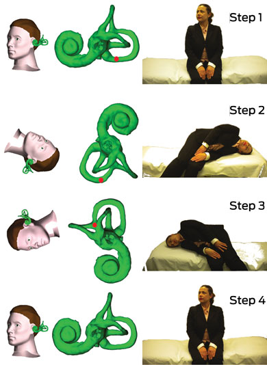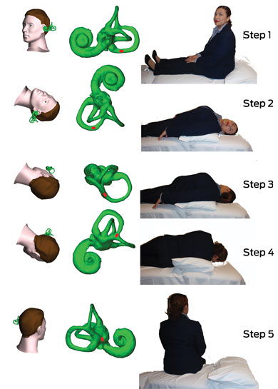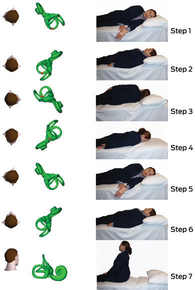 Step 1: The patient sits sideways on the bed with her head rotated 45° to the right, to bring the left posterior canal into the coronal plane. Step 2: The patient is rapidly layed down on the left side in a head-hanging position. Step 3: After 1 minute, the patient is moved to the opposite side, with her head still rotated 45° to the right. Step 4: After 1 minute, the patient returns to the upright position. These steps are animated in Video 7.