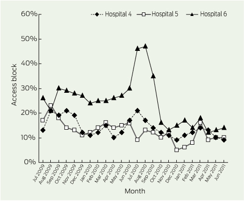 Overcrowding, as measured by access block, rose throughout 2000–2008 at the six hospitals (Box 3). Monthly access block in the tertiary hospitals fell from above 40% in July 2009 to around 10% by early 2011 (Box 4), while the three secondary hospitals, at a lower level overall, showed a much smaller decrease (Box 5).