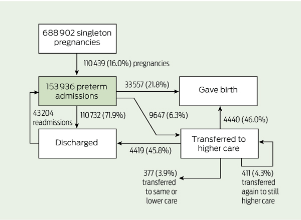 Results: 110 439 pregnancies (16.0%) involved at least one preterm admission. After their initial preterm admission, 71.9% of women were discharged, 6.3% were transferred and 21.8% gave birth. Median gestational age at admission was 33 weeks and median time to discharge, transfer or giving birth was 1 day. Most women who were transferred or who gave birth had been admitted for preterm rupture of membranes or preterm labour. Of the women who were admitted or were transferred with suspected preterm labour, only 29% and 38%, respectively, gave birth. Compared with other admitted women, women having a first birth, public patients and those living in areas of low socioeconomic status were more likely to be transferred or to give birth. As gestational age increased, the proportion of women transferred decreased and the proportion giving birth increased. Infants born after maternal transfer had lower gestational age and more adverse outcomes than those born without maternal transfer.