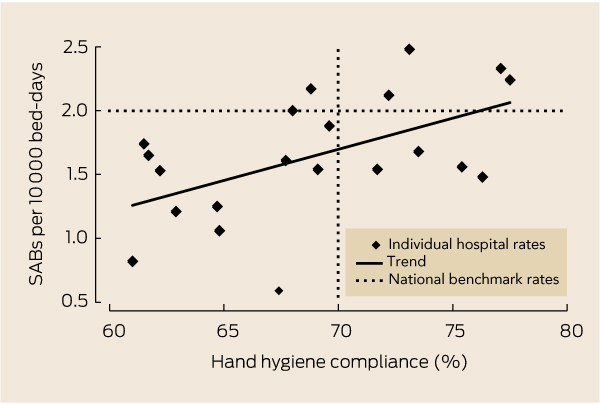 While HH is clearly important, it is only one of multiple interventions (including intravascular device management4) required to reduce HCA-SAB.5 This may explain why many hospitals are achieving low HCA-SAB rates despite low HH compliance. It is therefore vital that complex multimodal infection control strategies to prevent HCA-SAB and other infections not be simplistically summarised by HH compliance alone. With the media scrutiny of hospitals with HH compliance below the benchmark, it would be unfortunate if hospitals focused only on HH at the expense of other strategies, simply to achieve the HH benchmark and avert negative publicity.