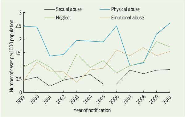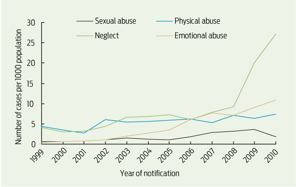 Over the past decade, coroners’ reports and government inquiries have highlighted the extent and tragedy of child maltreatment within Australia.1-3 The high risk among Aboriginal children has attracted particular attention.4-6 An increase in notifications of suspected maltreatment has been both a driver and an outcome of public attention, and by the 2009–10 financial year there were 286 437 notifications involving7 187 314 Australian children. The increase has not been consistent in all jurisdictions, with the Northern Territory showing a threefold increase over 5 years, to 6585 notifications in 2009–10.7