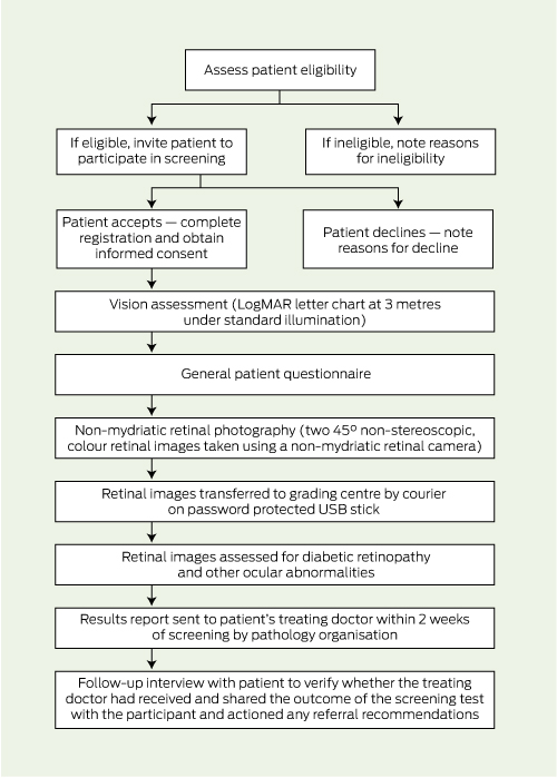 Early detection of diabetic retinopathy (DR) and timely treatment are integral to preventing vision-threatening DR in people with diabetes.1,2 The National Health and Medical Research Council (NHMRC) guidelines for the management of DR recommend biannual screening in those with no previous diagnosis and annual screening (at least) for those who have had a diagnosis of DR.3 However, population-based studies show that 30%–50% of Australians with diabetes do not undergo adequate screening.4-6 Despite the implementation of successful national screening programs worldwide,7,8 comprehensive DR screening strategies are lacking in Australia. We propose a novel screening strategy using pathology collection centres (PCCs) as screening sites. A PCC offers the potential to opportunistically screen people with diabetes for DR, as up to 90% of people with diabetes regularly attend PCCs for diabetes-related tests.9