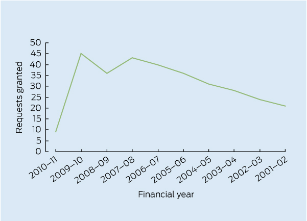 Other researchers have reported similar experiences. The AEC’s interpretation of medical research may have led to decreased numbers of researchers requesting or receiving ER data. In the 2010–11 financial year, the AEC granted nine ER extracts for medical research or health screening purposes. This represents a sharp decline from 45 recipients in 2009–10 and 36 in 2008–09. The Box shows the number of requests granted by the AEC by financial year, derived from the relevant AEC annual reports. The numbers may vary slightly because it is difficult to determine whether multiple requests have been granted for individual studies. The number of requests granted for 2010–11 is out of keeping with the general trend. The number of refusals is not recorded.
