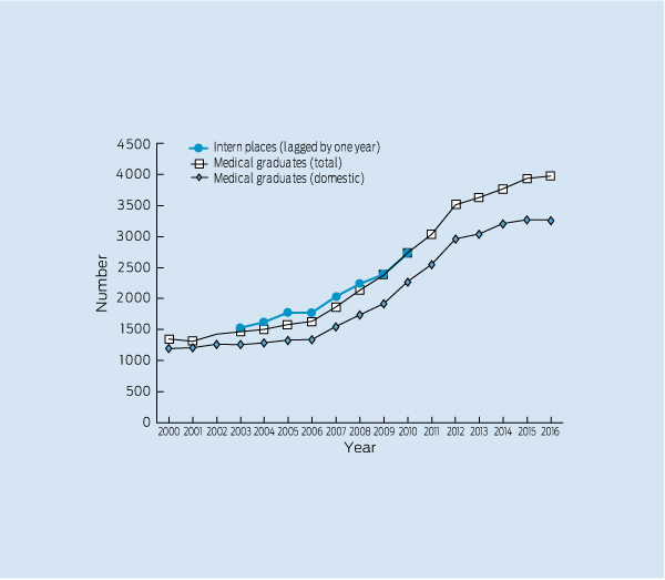 * Actual numbers shown up to 2010, and projected numbers of graduates for 2011–2016.11 Numbers of intern places are shown lagged by 1 year to display the relationship to the number of graduates in the previous year (eg, data shown for internships for 2003 is number of internships in 2004, which are largely taken up by 2003 graduates).