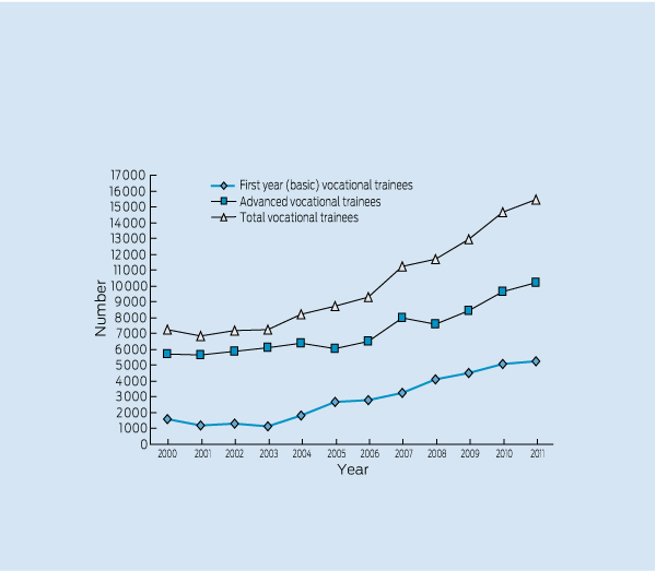2 Vocational trainees: basic, advanced and total trainee numbers, 2000–2011*11