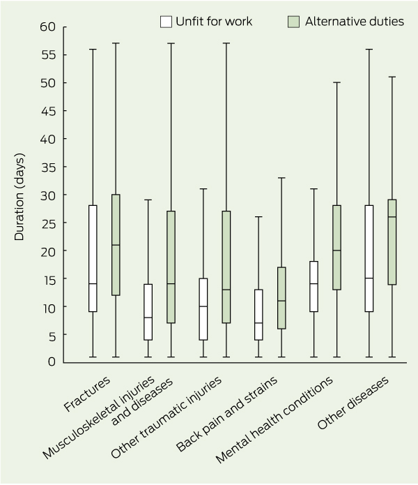 Results: Of 124 424 initial medical certificates issued by GPs, 74.1% recommended that workers were unfit for work and 22.8% recommended alternative duties. Unfit-for-work certificates were issued to 94.1% of workers with mental health conditions, 81.3% of those with fractures, 79.1% of those with other traumatic injuries, 77.6% of those with back pain and strains, 68.0% of those with musculoskeletal conditions and 53.0% of those with other diseases. Alternative-duties certificates were significantly longer in duration than unfit-for-work certificates in all injury and illness categories (P < 0.001) but certificates for workers with musculoskeletal injuries and diseases, back pain and strains and other traumatic injuries were of lesser duration than those for workers with fractures, mental health conditions and other diseases.