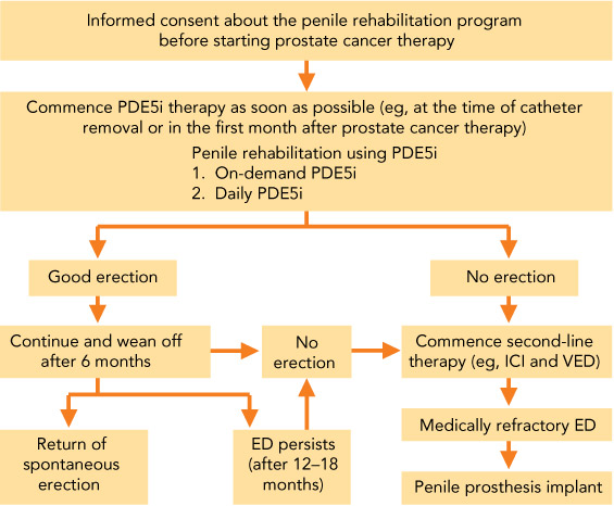 The underlying mechanisms leading to ED have been elucidated in various animal models and include neuropraxia, vascular ischaemia and cavernosal apoptosis and fibrosis. Because the current evidence shows that absence of nocturnal and spontaneous erections leads to ED and penile length loss, putting a rehabilitation strategy in place as early as possible is mandatory. The role of penile rehabilitation using PDE5i is still evolving, as the current clinical trials have significant limitations. While there is no consensus on the appropriate PDE5 inhibitor, dose and regimen, its role in combination therapy and the specific cohort of patients, most sexual health experts agree that therapy with an oral PDE5 inhibitor should be started as soon as possible to protect and/or prevent corporal endothelial and smooth muscle damage. Second-line therapies such as intracorporal injection of vasoactive agents and vacuum erection devices should be offered to men who wish to remain sexually active and preserve their penile length, and a penile implant should be considered when patients fail to respond to medical therapies.