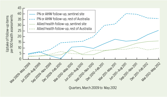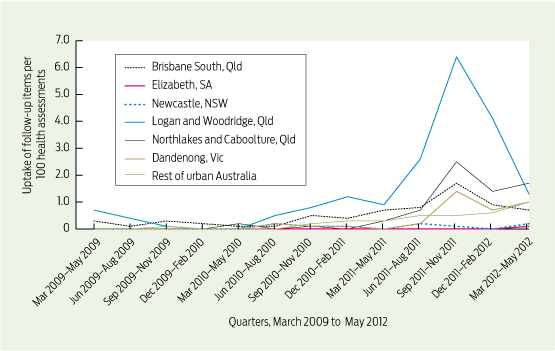 Aggregated data show a general improvement in uptake of health assessments and follow-up items after the baseline period, with some differences in trends between the sentinel sites and the rest of Australia (Box 2 and Box 3). The uptake of follow-up items was disproportionately low compared with health assessments. There were marked differences in trends between individual sites (Box 4) — more marked than differences between sites according to rurality.5