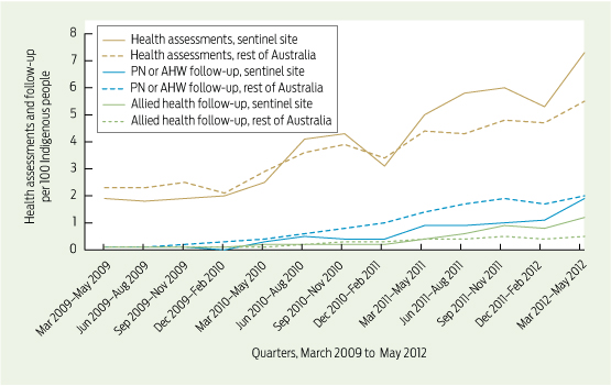 A recent systematic review shows that while health assessments may increase new diagnoses, there is a lack of evidence of their effect on morbidity and mortality.1 While the reasons for lack of impact of health assessments are not well understood, it is clear that health assessments have limited potential to impact on health outcomes in the absence of appropriate follow-up care.5-7 The $805 million Indigenous Chronic Disease Package (ICDP) introduced by the Australian Government in 2010 included program funding and a new workforce to help increase the delivery of health assessments and appropriate follow-up.8